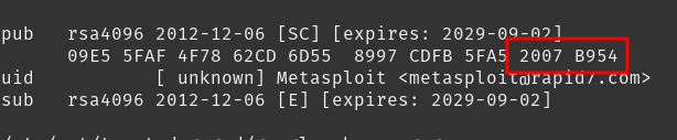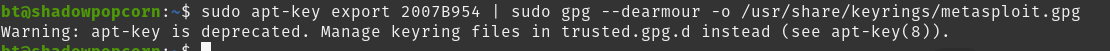 sudo apt-key export 2007B954 | sudo gpg --dearmour -o /usr/share/keyrings/metasploit.gpg